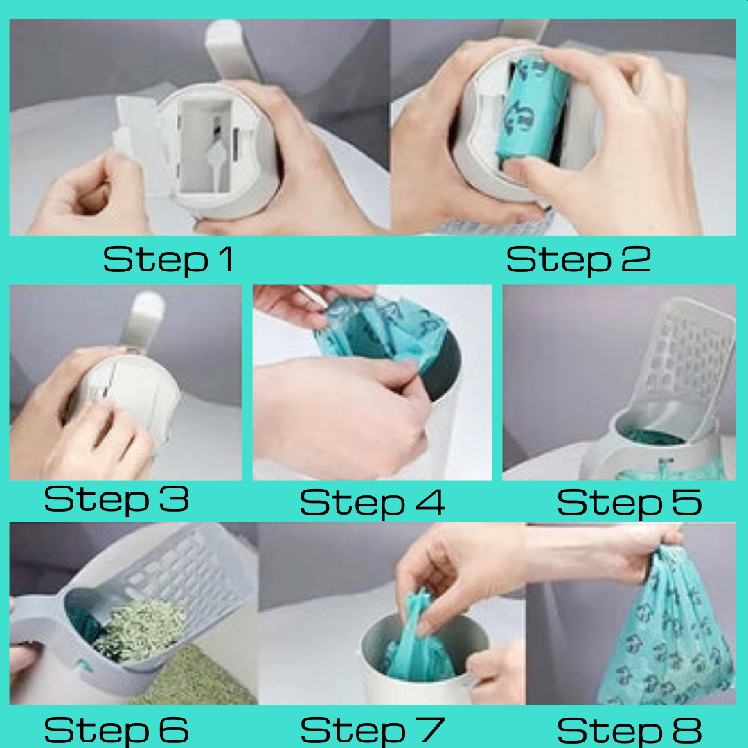 En quelques secondes seulement notre pelle a litière avec réservoir CatParadise™, la litière de votre chat sera débarrassée grâce à sa conception munie de grille qui sépare la litière sale de la propre et est directement diriger dans le sac à déchet.